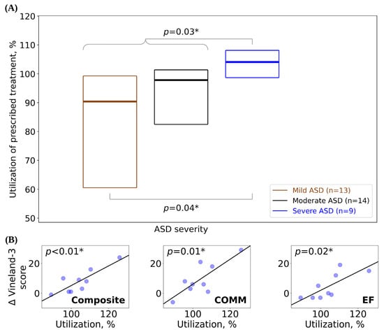 (A) Utilization of prescribed treatment (box plots display median as a line between the first and third quartiles) for patients stratified by ASD severity level. (B) Change in Vineland-3 scores as a function of utilization for the severe ASD cohort. Best-fit lines generated using simple linear regression (p-values for slope ≠ 0, using Wald test with a t-distribution). Δ = mean change in Vineland-3 score between baseline and follow-up; Composite = Adaptive Behavior Composite; COMM = communication; EF = executive functioning. * = p-value significant at the 0.05 threshold.