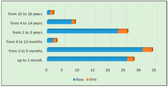 Among the children with ARA, 91 (89.2%) were boys and 11 (10.8%) were girls, as shown in Table 1. The mean age of the children included in the study was 1.6 years (SD ± 3.15). The mean age of boys (n = 91) was 1.45 years, SD ± 2.93, while the mean age of girls (n = 11) was 2.79 yrs, SD ± 4.43. Of the children that were operated on, the youngest patient was 1 month old and the oldest was 17 years old. The most affected age group among children was neonates and infants, with a total of 65 patients (63.7%), as shown in Figure 1. In infancy, seven children (6.9%) were found to have concomitant diseases, most of them with a congenital genesis.