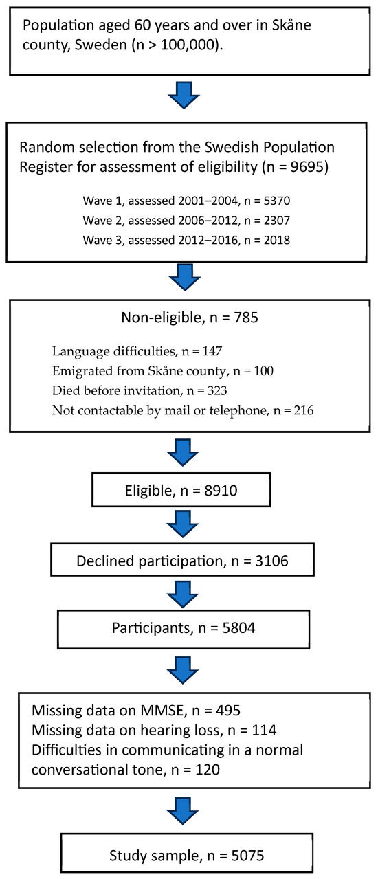 In this cross-sectional study, participants were drawn from the “Good Aging in Skåne” (GÅS) longitudinal population study, which is part of the Swedish National Aging and Care (SNAC) project [37]. The design of the GÅS study is described elsewhere [38,39]. Participants were randomized from the national population register in three waves between the years 2001 and 2016. Eligible participants were invited by phone or letter and written informed consent was obtained from those who accepted the invitation. In total, 5804 (60%) eligible participants aged 60 to 94 years living in the county of Skåne, the southernmost part of Sweden, were included. Exclusion criteria were incomplete MMSE data, which resulted in the exclusion of 495 (8.5%) participants, as well as missing hearing loss data, leading to the exclusion of a further 114 (2.0%) participants. As the MMSE was conducted in the form of an interview, another 120 individuals were excluded as they reported difficulties in communicating in a normal conversational tone. Finally, the study sample consisted of 5075 individuals, 2325 (45.8%) men and 2750 (54.1%) women (Figure 1).