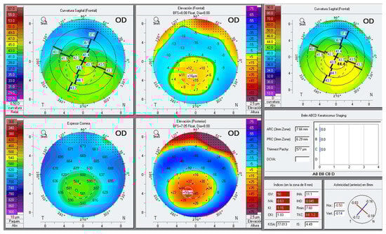 As for topographical parameters (Table 2), K1, anterior Km, and Kmax were significantly increased in the AA group (p < 0.05). Although values were higher in AA patients, differences in K2, posterior elevation, or posterior Km were not statistically significant. Thinner pachymetry values were detected in AA patients (p ≤ 0.001). KI showed a significant increase among AA patients (p = 0.007), as well as BAD-D (1.3 ± 0.7 vs. 0.8 ± 0.6; p = 0.026). ART-max showed a significant decrease in AA patients. In addition, two eyes (4%) with a topographic diagnosis of keratoconus and another four eyes (8%) with subclinical keratoconus were detected in the AA group (Figure 1). No cases of clinical or subclinical keratoconus were noted among the controls.