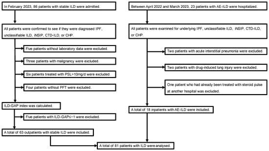 - Drakopanagiotakis, F.; Markart, P.; Steiropoulos, P. Acute exacerbations of interstitial lung diseases: Focus on biomarkers. Int. J. Mol. Sci. 2023, 24, 10196. [Google Scholar] [CrossRef] [PubMed]