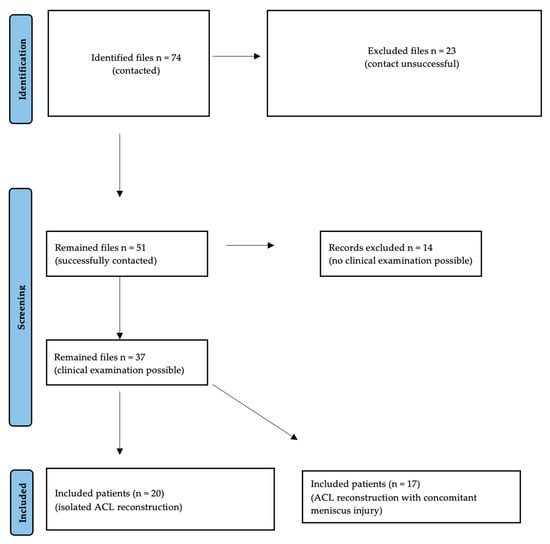 A total of 74 patients met the inclusion criteria. All patients were contacted and invited for clinical and radiological follow-up examinations. A total of 51 patients were successfully contacted, 37 of whom attended the follow-up examination. A total of 20 patients underwent an isolated ACL reconstruction group (group 1), whereas 17 patients underwent ACL reconstruction with concomitant meniscus injury (group 2) (Figure 1).