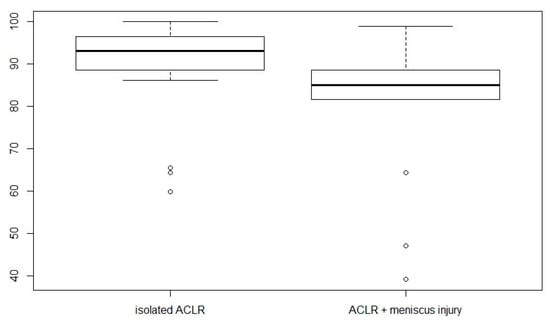 The Lysholm score did not differ significantly between the two groups (Figure 3). The mean value was 87.3 ± 17.4 in the “isolated ACLR” group and 86.7 ± 16 in the “ACLR with medial meniscus injury” group.