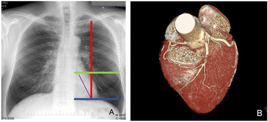 Computed tomography (CT) (third-generation 192-slice dual-source SOMATOM Force, Siemens Healthineers, Erlangen, Germany) and chest X-ray are commonly performed to delineate the heart anatomy and its relationships with the surrounding thoracic structures (Figure 1A,B).