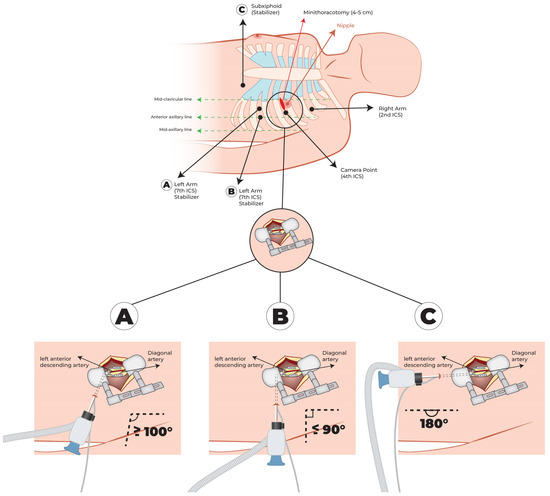 Second, fourth and seventh, intercostal space marked to guide ports positioning. Fourth or fifth intercostal space defined for mini-thoracotomy. (A–C) possible sites of coronary stabilizer according to patient’s chest and heart anatomy and resulting angle between the arm and the terminal movable portion of the stabilizer.