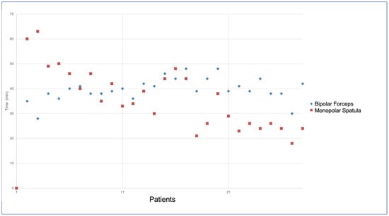 The shift in instrument use during the “learning curve” in RA LITA harvesting. Red dots identify the monopolar spatula; blue dots identify the bipolar forceps.