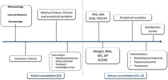 Schematic depicting the multidisciplinary dermatology–internal medicine clinic. Time periods: t1 or baseline, t2 or intermediate (12–18 months after baseline visit), and t3 or final (12–18 months after intermediate visit). (BMI, body mass index; WC, waist circumference; BP, blood pressure, PASI: Psoriasis Area and Severity Index; BSA: Body Surface Area; DLQI: Dermatology Life Quality Index; PSO-life: Psoriasis Quality of Life).