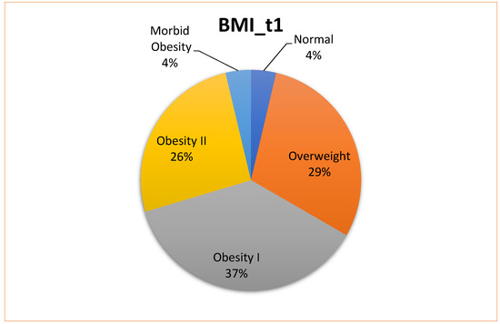 More than 60% of the patients who attended the dermatology–internal medicine clinic presented some degree of obesity; only 4% of patients had a normal BMI at baseline (t1) (these data were not available for the control group) (Figure 2). The mean BMI in the control group was significantly lower at both follow-up timepoints (t2 and t3) (Table 5) compared with the cases.