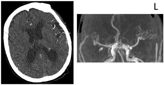 COLLATERAL SCORE: 3–75-year-old male patients. Left MCA infarction. NIHH Score: 9. CT angiography was performed 5 h after the acquisition of clinical findings. Left image, “Subtracted MIP image obtained from arterial phase images”. Right image, “Raw image in the axial plane obtained in the arterial phase after contrast injection”. Arrows represent collateral score area.