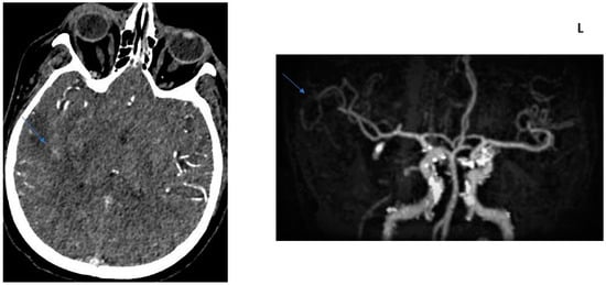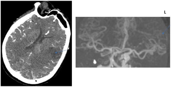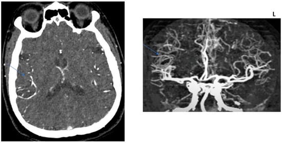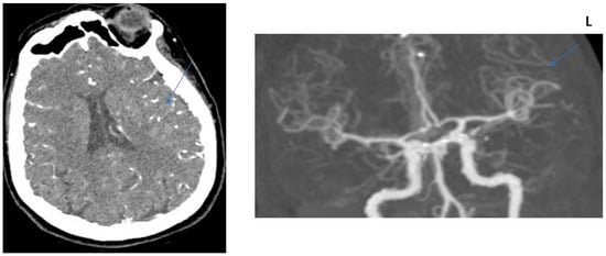 COLLATERAL SCORE: 2–71-year-old female patients. Left MCA infarction. NIHH Score: 18. CT angiography was performed 6 h after the acquisition of clinical findings. Left image, “Subtracted MIP image obtained from arterial phase images”. Right image, “Raw image in the axial plane obtained in the arterial phase after contrast injection”. Arrows represent collateral score area.