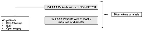 A total of 164 patients with AAA had a whole body [18F]FDG PET/CT examination and a blood sample drawing at baseline. Among those 164 patients, 43 were not followed-up for the purpose of the study because they underwent surgery (EVAR or open surgery), or they were patients lost-to-follow up. The remaining 121 patients had at least a second PET/CT scan to assess AAA progression as well as another blood sample collection (Figure 1).