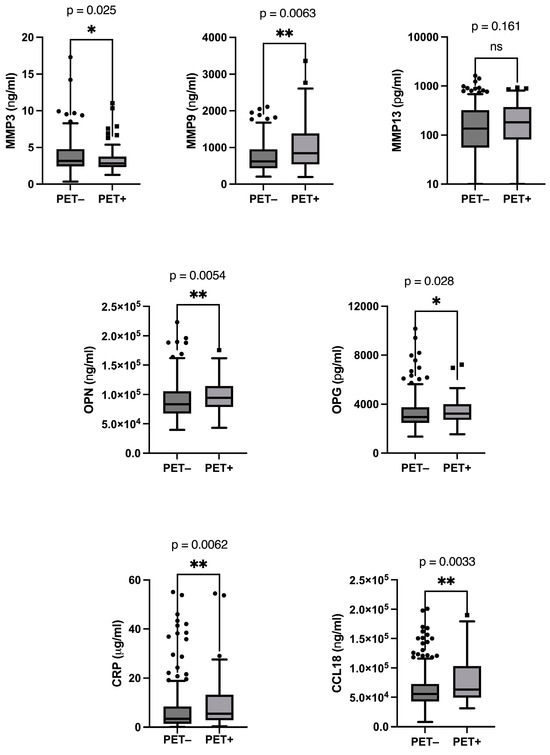Blood samples were collected in EDTA (for plasma) and dry vacutainer (for serum) tubes from all patients at the same time of initial PET/CT and at follow-up PET/CT exams. Serum and plasma were separated by centrifugation for 10 min at 3000× g within 30 min after blood collection. A total of 321 blood samples were obtained. Commercial ELISA kits were used to measure the chemokine CCL18, MMPs (MMP3, MMP9, MMP13), and osteopontin (OPN), osteoprotegerin (OPG). CRP, CCL18, and MMPs were measured in serum, while OPN and OPG were measured in plasma.