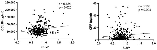 The levels of AAA biomarkers were determined in patients who had an evaluation of the progression of the size of the AAA with PET/CT, for a total of 321 SUVr measurements and a median (quartiles) follow-up time duration of 32.8 months (15.2–69.6 months). Statistical analysis of biomarkers levels in PET+ versus PET− patients revealed that MMP9, a collagenase factor, but not MMP13 (p = 0.161), was significantly increased in patients categorized as PET+ (p = 0.0063) (Figure 2). Moreover, the levels of MMP9 were also significantly correlated with the SUVr measured using PET/CT at the same time of the blood drawing (MMP9: r = 0.223 and p = 0.0002). Surprisingly, the levels of MMP3 (stromelysin-1), another collagenase well known to be upregulated in AAA [19,20,21], were significantly but weakly decreased in patients with a PET+ (p = 0.025). OPN and OPG, two factors involved in the remodeling of extracellular matrix, were significantly increased in patients with a PET+ (p = 0.0054 and p = 0.028, respectively). Finally, two pro-inflammatory factors, CRP and CCL18, were significantly increased in patients with a PET+, p = 0.0062 and p = 0.0033, respectively (Figure 2), and they were significantly correlated with the SUVr determined at the same time of the blood drawing (CRP: p = 0.004; CCL18: p = 0.026) (Figure 3), although the correlation was weak (CRP: r = 0.160; CCL18: r = 0.124).