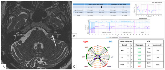 Clinical example of a left vestibular schwannoma (Koos stage 2, white arrow). (A) T2 MR image showing a left vestibular schwannoma (white arrow); (B) a vibration-induced nystagmus test result (SVINT 3); (C) a vHIT test result.
