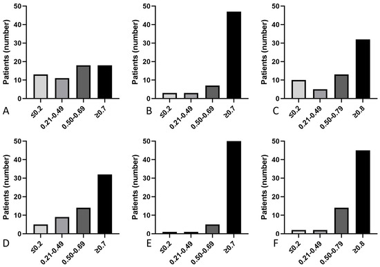 Distribution of VOR gains on the VS side. Distribution of VOR gains on the VS side for the posterior SCC (A), anterior SCC (B), and lateral SCC (C), and on the healthy side for the posterior SCC (D), anterior SCC (E), and lateral SCC (F) with personalized cutoffs. Continuous variables were divided into four groups, ≤0.2, 0.21–0.49, 0.50–0.69, and ≥0.7 for posterior and anterior SCC, and ≤0.2, 0.21–0.59, 0.60–0.79, and ≥0.8 for lateral SCC, both on the VS side and on the healthy side.
