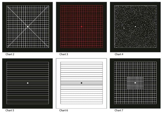 To suit different patient profiles, there are six other types of Amsler grids, charts 2–7, as shown in Figure 3 [8].