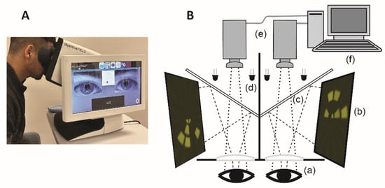 At a given time, stimuli are presented in different VF locations of two eyes to reduce any binocular rivalry. Both direct and consensual responses are recorded in each stimulus region. Although the inter-individual variation is high, the intra-individual responses are consistent, encouraging investigators to explore pupillography to provide objective perimetry. Pupillary responses have been elicited by various stimuli, commonly change in luminance [111,112], colour [113,114], depth perception and motion [115], and spatial content [116].