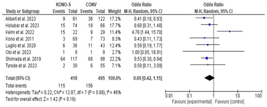 All eligible studies provided data regarding the primary outcome (Figure 2, Table 2). Pooled evidence did not confirm a superiority (OR: 0.69 [0.42, 1.15], p = 0.16) of Kono-S over conventional anastomosis after bowel resection in patients with CD. Due to significant heterogeneity levels (I2: 46%, p = 0.08), further explanatory analyses were performed. The results of meta-regression (Supplementary Materials) could not confirm a significant effect of any analyzed variable (publication year, sample size, gender, age, BMI, follow up, smoking, previous operation, perianal disease, anti-TNF medication, laparoscopic approach, stapled conventional anastomosis, and resected length of bowel). Stratifying for ileocolic anastomoses (OR: 0.83 [0.4, 1.73], p = 0.61) and side-to-side conventional anastomoses only (OR: 0.89 [0.29, 2.75], p = 0.84) did not alter the overall outcome. A non-significant result was also estimated in the experienced surgeons’ subgroup (OR: 1.67 [0.37, 7.64], p = 0.51). A significant superiority of Kono-S (Supplementary Materials) was confirmed in the prospective (OR: 0.47 [0.24, 0.89], p = 0.02), but not in the retrospective studies subgroup. Exclusion of high risk of bias studies resulted in a significant effect of the experimental technique (OR: 0.47 [0.24, 0.89], p = 0.02).
