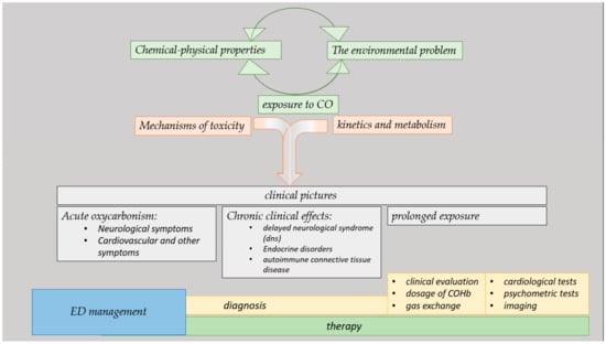 The ultimate aim of our work is to bring together the pathogenesis, mechanisms of damage, and symptoms related to CO intoxication with a view to its treatment in emergency department settings, providing ideas that can lead to the early recognition of intoxication and its treatment.