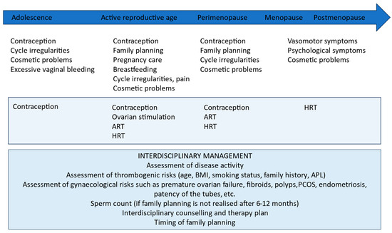 The management of women with SARDs poses challenges to both rheumatologists and gynecologists, highlighting the need for interdisciplinary care covering woman’s reproductive lifespan, starting with counselling about possible contraceptive methods, through reproductive challenges and pregnancy, breastfeeding, and including the periods of perimenopause and menopause (Figure 2).