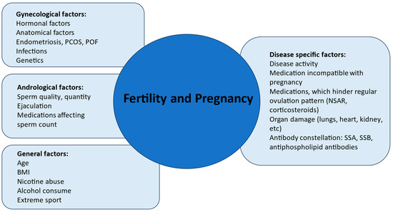 Factors affecting fertility and pregnancy in patients with SARDs. Legend: Several factors affect fertility and pregnancy course in SARDs. An interdisciplinary team should evaluate disease specific factors, which contribute to risk stratification, such as disease activity, antibody profile, organ involvement. Timing of a pregnancy should be planned at a time of disease quiescence and medication use should be adjusted to non-teratogenic therapy. Risk factors such as APL and SSA or SSB antibodies should be evaluated in order to foresee appropriate management before, during, as well as after pregnancy. Gynecological and andrological factors should be timely evaluated if time to pregnancy is over 6 months (in women older than 35) or 12 months (in individuals younger than 35) or if timing of conception is only possible in a short time window. Modifiable general risk factors should be optimized. Abbreviations: PCOS, polycystic ovary syndrome, SARD, systemic autoimmune rheumatic disease, BMI, body mass index.