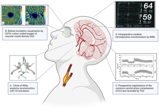 Cerebrovascular reactivity (CVR) is the mechanism behind the process which occurs through the constriction and dilation of cerebral resistance vessels to maintain a constant blood flow. While static autoregulation assesses long-term changes in blood pressure, dynamic autoregulation focuses on immediate changes within seconds to minutes [54]. The latter is particularly relevant in scenarios such as carotid artery reconstruction with carotid clamping without shunting, where the timing of CVR changes is critical. In the upcoming text, we will delve into various non-invasive diagnostic tools, such as imaging of retinal circulation by optical coherence tomography angiography (OCTA) and classical non-invasive neuromonitoring methods, such as functional transcranial Doppler (fTCD) and near-infrared spectroscopy (NIRS).