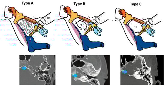 CT classification of cholesterol granulomas. V, fifth cranial nerve; ica, internal carotid artery; jb, jugular bulb; iac, internal auditory canal; lb, labyrinthine block; c, cochlea; eac, external auditory canal; gg, geniculate ganglion; sps, superior petrosal sinus; cg: cholesterol granuloma; blue arrows, cholesterol granuloma on the CT scans.