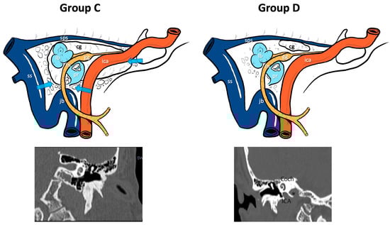 In addition, relying on CT scans, for each type of PACG, we decided to divide the three types (A, B, C) into two subgroups (C—connected and D—non connected) based on the presence or lack of connection of the PACG with the infracochlear/perilabyrinthine and sphenoidal cellularity. This subdivision can inform us on the presence of favorable anatomical conditions (group C) to perform a fenestration/drainage of the cholesterol granuloma through the infralabyrinthine, infracochlear or trans-sphenoidal corridors. In contrast, in case of a lack of connection to the air cell tracts (group D), we can opt for a total/subtotal/near-total removal (via a middle cranial fossa approach) in case of good hearing or for a total removal (via a combination of a transotic and infratemporal fosse Type B approaches) in case of profound pre-operative sensorineural hearing loss.