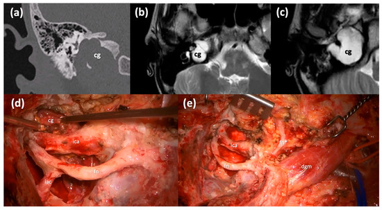 Middle cranial fossa approach. (a) Axial CT scan of a right Type C PACG with erosion of the horizontal ICA bone walls. (b,c) Axial and Coronal T1-weighted MRI sections of the same PACG, showing the typical hyperintense signal. (d) Surgical step: a craniotomy has been performed and the dura of the middle cranial fossa is carefully elevated from the skull base. (e) Surgical step: the lesion is identified after the Kawase triangle drilling. cg: cholesterol granuloma; mcf, middle fossa dura; gspn, greater superficial petrosal nerve; ae, arcuate eminence; ica, internal carotid artery.