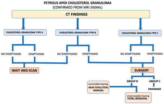 From our study based on the radiological appearance of the petrous apex on the CT scan, we classified three types of cholesterol granuloma (A, B and C) based on the remodeling of the petrous apex bone caused by the lesion. This radiological classification of PACGs could be helpful in the decision-making flowchart of the patient suffering from this lesion (Figure 6).