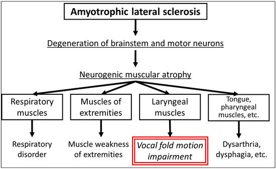 ALS is a neurodegenerative disease that affects motor neurons and leads to progressive muscle weakness and atrophy. Patients with ALS can experience various vocal fold abnormalities, including paradoxical adduction patterns, aperiodic vocal fold vibrations, hyperadduction of the ventricular folds, and hypoadduction of the vocal folds. These abnormalities can lead to symptoms of dysphonia, dysarthria, and dysphagia, which are prevalent in the bulbar form of ALS that primarily affects the brainstem and cranial nerves [39,40]. The exact pathophysiology of vocal fold dysmotility in ALS is not fully understood; however, it is thought to have multiple causes involving both infranuclear and supranuclear origins, resulting in the degeneration of the motor neurons that control the muscles of the larynx [41,42,43,44] (Figure 2).