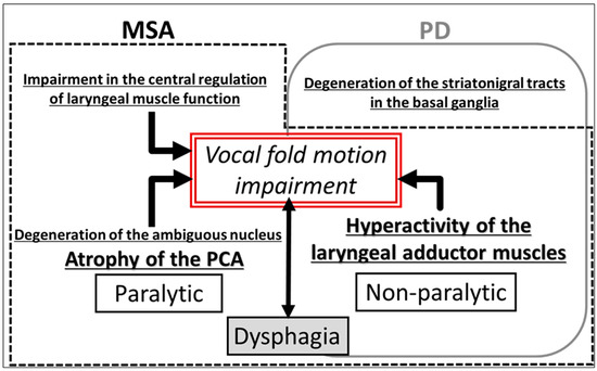 MSA is a progressive neurodegenerative disorder characterized by autonomic dysfunction, parkinsonian disorder, and cerebellar dysfunction as the main symptoms. MSA is classified into parkinsonian (MSA-P) and cerebellar (MSA-C) variant types [9]. VFMI is a common issue in patients with MSA and is found in approximately half to two-thirds of the patients [9,51,52,53,54]. In particular, patients with MSA-P can develop VFMI earlier than patients with MSA-C because the spontaneous activity of intrinsic laryngeal muscles in patients with MSA-P can lead to an earlier onset of VFMI [9]. There are two plausible hypotheses for the pathophysiology of VFMI: (1) a severe loss of neurons in the nucleus ambiguus results in hypoactivity and neurogenic atrophy of the posterior cricoarytenoid muscle, which is the sole laryngeal abductor muscle, or (2) dystonia is induced by hyperactivity of the laryngeal adductor muscles [55,56] (Figure 3).