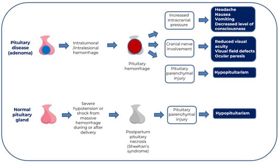 Several pathophysiological mechanisms have been implicated in the development of PA, including: (1) intralesional hemorrhage (PitNETs, infectious and inflammatory processes, and vascular malformations); (2) acute increase in pituitary blood flow (hypertensive crises, trauma, increased physical activity, and increased intracranial pressure); (3) increased blood flow demands in a growing PitNET whose needs exceed blood supply causing ischemic necrosis; (4) pituitary ischemia in situations of low blood supply, as in surgery, especially cardiac, radiotherapy, spinal anesthesia, and severe hypotension or hypovolemic shock after hemorrhage during childbirth; (5) pituitary and tumor hormonal stimulation (pituitary stimulation endocrine tests, especially TRH test, and the use of GnRH analogs, pregnancy, and exogenous estrogen therapy); and (6) coagulation disorders (thrombocytopenia, coagulopathies, and antiplatelet and anticoagulant drugs) [9,28,29,30,31].
