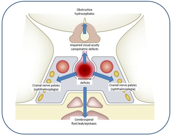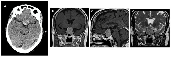 The main symptoms associated with PA are headache (89%), ophthalmoplegia (78%) (mainly due to third cranial nerve palsy, followed by fourth and sixth cranial nerve palsies), vomiting (69%), campimetric defects (64%), and decreased visual acuity (52%) [56,57,58]. Hypopituitarism is frequent, with gonadotropin deficiency being the most common hormone deficiency (75%), followed by corticotropin deficiency (70%) and thyrotropin (50%) [59]. Almost all patients with PA have GH deficiency at diagnosis, although GH deficiency is not usually tested at the time of diagnosis [55,58]. Some authors have suggested that low serum prolactin levels may indicate a greater degree of pituitary destruction and, therefore, a lower likelihood of pituitary function recovery after surgery [31,36]. Hyponatremia may occur in up to 40% of patients with PA secondary to adrenal insufficiency, central hypothyroidism, or the syndrome of inappropriate secretion of antidiuretic hormone (SIADH) [52]. In rare cases, epileptic seizures, hemiplegia, and diabetes insipidus have also been reported [60,61,62].