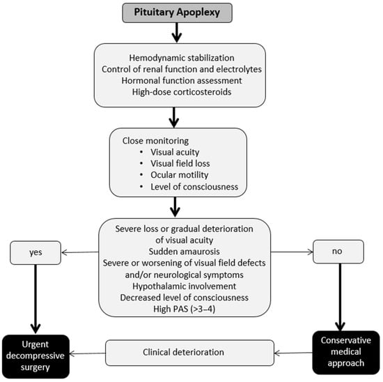 The ideal therapeutic approach of PA is not clearly defined and remains controversial. While some authors favor early transsphenoidal surgical decompression in all patients, others recommend a conservative approach in selected patients [55,112]. It is important to note that the extent of hemorrhage/ischemia, the symptomatology at presentation, and the clinical course of PA can vary considerably from patient to patient. Therefore, symptoms may vary from a mild headache with mild visual disturbances occurring over several days to a severe headache of abrupt onset with severe visual disturbances and even decreased level of consciousness. However, most patients have symptoms between these two extremes. Patients without neuro-ophthalmologic symptoms or with mild and stable symptoms and/or signs may be managed conservatively under close supervision. On the other hand, patients with worsening visual acuity, level of consciousness, or visual field defects should undergo urgent MRI to plan surgical decompression. In any case, because PA is a medical emergency, treatment must be individualized and tailored to each patient after a thorough evaluation by a multidisciplinary team, including a neuroradiologist, an endocrinologist, an ophthalmologist, and a neurosurgeon with expertise in pituitary pathology [55,108,112].
