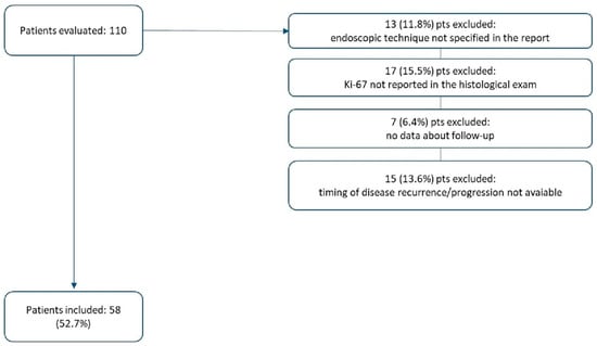 A total of 110 patients [M: 57 (51.8%)/F: 53 (48.2%)] were evaluated for inclusion in our study. Of these patients, thirteen patients (11.8%) were excluded because the endoscopic resection technique was not evaluable in the endoscopic report; seventeen patients (15.5%) were excluded because the proliferative index was not expressed in the histological exam (slides for histological revision were not available); seven patients (6.4%) were excluded because follow-up data were not available; and fifteen patients (13.6%) were not included because the timing of the disease recurrence/progression was not specified in the available charts (Figure 1).
