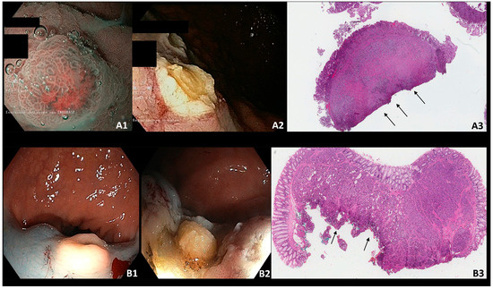 (A) Type I g-NEN—incomplete endoscopic resection; (A1): type 1 g-NEN in NBI (Narrow Banding Imaging); (A2): residual tissue after endoscopic resection; (A3): histological slide with positive deep resection margin (arrows). (B) R-NEN–incomplete endoscopic resection; (B1): r-NEN in white light image; (B2): residual tissue after endoscopic resection; (B3): histological slide with positive deep resection margin (arrows).