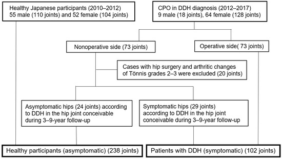 Of these 340 joints, patients were divided into two groups: healthy (asymptomatic) (238 joints) and DDH (symptomatic) (102 joints). The healthy group comprised 107 healthy participants (214 joints), from 2010 to 2012, and those with asymptomatic hips (24 joints) on the nonoperative side of the CPO group from 2012 to 2017, according to DDH in the hip joint conceivable during follow-up for 3–9 years. Patients with DDH (symptomatic) (102 joints) were further classified as those with operative side (73 joints) CPO from 2012 to 2017 and with symptomatic hips (29 joints) on the nonoperative side of the CPO group from 2012 to 2017, according to conceivable DDH in the hip joint during the follow-up (Figure 1).