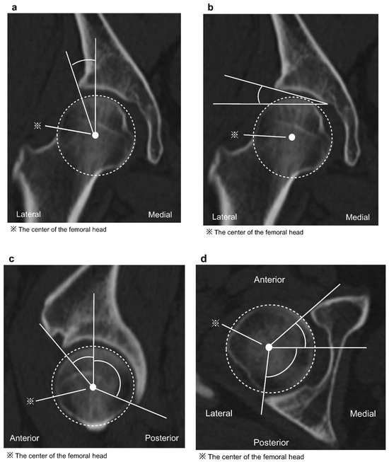 Developmental dysplasia of the hip (DDH) causes hip osteoarthritis (OA) [1,2] and is the most common cause of coxarthrosis, particularly in Japan and other Asian countries [3,4]. Morphological abnormalities associated with DDH cause cartilage degeneration and osteoarthrosis due to a concentration of joint contact pressure [5,6]. In the diagnosis and assessment of the severity of DDH, the center-edge (CE) angle between a line connecting the center of the femoral head and the acetabular margin and a line perpendicular to a line connecting the bilateral tear drops [7], Sharp angle [8], and acetabular roof obliquity (ARO) [9] from the anteroposterior plain radiograph of the hip joint and, in particular, the lateral CE angle is considered an index of load stress on the acetabular articular cartilage and joint lip [10] and is an important radiographic index. Wiberg defined the CE angle for acetabular dysplasia as normal at ≥25°, borderline at 20–25°, or abnormal at <20° [7]. In Japan, a CE angle < 20°, a Sharp angle > 45°, and an ARO > 15° on anteroposterior plain radiography are used as judgment criteria [3]. However, no consensus currently exists regarding these criteria [11]. Information is available on the lateral coverage of the femoral head obtained from conventional anteroposterior radiographs by measuring the CE angle [7] and anterolateral coverage from false-profile lateral radiographs by measuring the anterior center-edge angle [12,13,14,15]. However, these two-dimensional (2D) images lack three-dimensional (3D) information, and accurate quantification of the degree and location is difficult [16].
