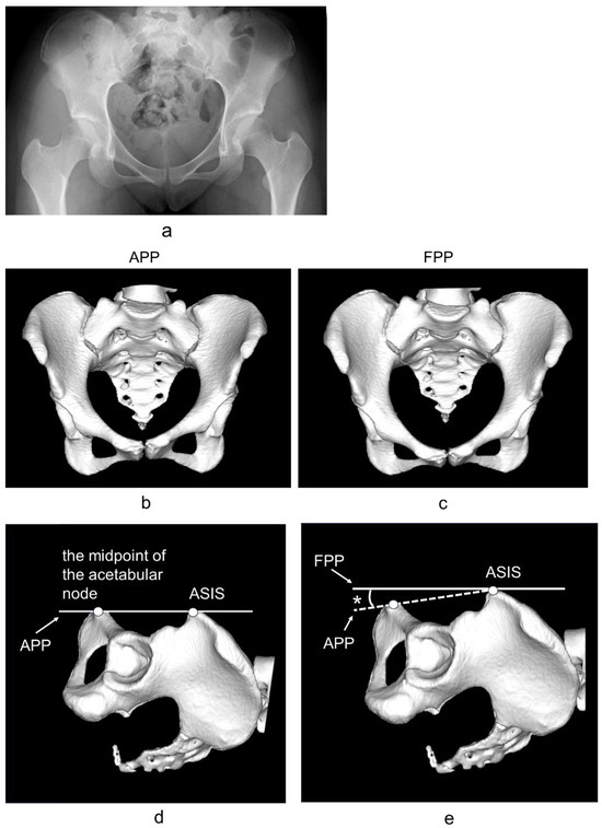 (a) Anteroposterior plain radiograph of the hip joint. (b) Frontal view of a pelvic three-dimensional computed tomography reconstruction obtained by aligning the pelvis with the anterior pelvic plane (APP), which is based on the plane consisting of the left and right anterior superior iliac spines (ASISs) and the midpoint of the acetabular node. (c) Frontal view of a pelvic three-dimensional computed tomography reconstruction obtained by aligning the pelvis with the functional pelvic plane (FPP) (the table plane in the supine position was used as a reference, reflecting the APP sagittal inclination in the supine position). (d) Lateral view of a pelvic three-dimensional computed tomography reconstruction obtained by aligning the pelvis with the anterior pelvic plane (APP), which is based on the plane consisting of the left and right anterior superior iliac spines (ASISs) and the midpoint of the acetabular node. (e) Lateral view of a pelvic three-dimensional computed tomography reconstruction obtained by aligning the pelvis with the functional pelvic plane (FPP) (the table plane in the supine position was used as a reference, reflecting the APP sagittal inclination in the supine position). * Sagittal inclination of the APP in the supine position.