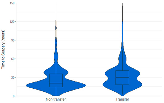Violin plot showing time to surgery (hours) for non-transfer and transfer patients, outliers truncated at 150 h.