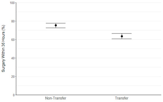 Error bar chart showing the percentage of patients within the non-transfer and transfer groups to achieve surgery within 36 h of admission.