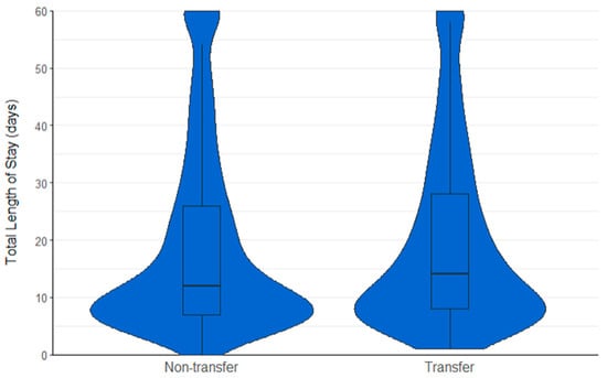Violin plot showing the total LOS (days) for non-transfer and transfer patients.