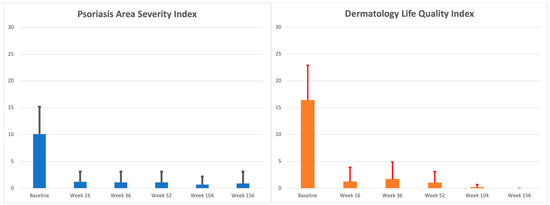 Mean PASI and DLQI assessment (mean value and standard deviation) at baseline, week 16, week 36, week 52, week 104, and week 156.