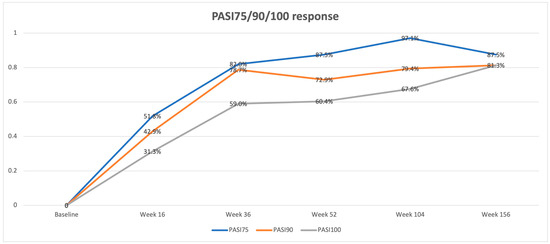 Percentage of patients achieving PASI75/90/10 response at week 16, week 36, week 52, week 104, and week 156.