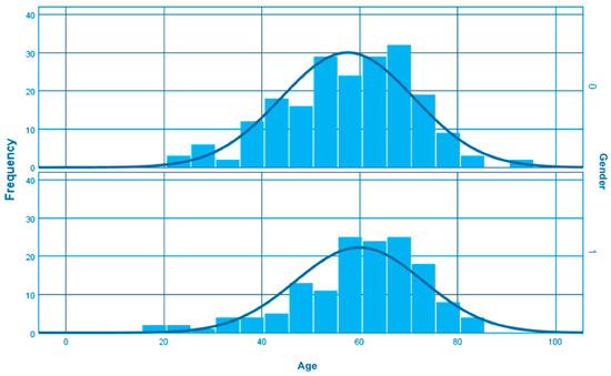 A total of 350 patients with coronary artery anomalies were identified in our dataset. Among these individuals, 204 (58.3%) were male and 146 (41.7%) were female. The median age was 58.49 years showing slight differences between genders, as men presented a median age of 57.5 and women 59.9 years (Figure 1).