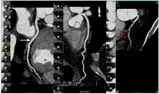 Coronary computed tomography angiography figure illustrates a case of right hypoplastic coronary artery (red arrow) alongside normal left circumflex artery (white arrow) and left anterior descending artery (blue arrow) (images are upscaled to a 2.5 factor).