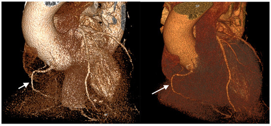 Coronary computed tomography angiography of hypoplastic right coronary arteries (white arrow) (images are upscaled to a 2.5 factor).