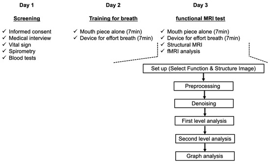 Data were collected during three separate visits (Figure 1). On the first day, participants provided written informed consent and underwent a medical history assessment. The participants then underwent vital sign measurements, including cognitive levels using the modified Hasegawa dementia scale [24], respiratory rate, heart rate, blood pressure, body temperature, modified Borg scale score, and resting SpO2. Spirometry and blood tests were also performed. Enrolment criteria encompassed meeting the following thresholds: 30 points on the modified Hasegawa dementia scale, respiratory rates < 20 breaths/min, systolic blood pressure < 150 mmHg, heart rate 40–80 beats/min, body temperature < 37.0 °C, modified Borg scale < 0.5, SpO2 > 96%, and normal lung function (% forced vital capacity (%FVC) prediction > 80%, % forced expiratory volume in 1 s (%FEV1.0) prediction > 80% of prediction, and the FEV1.0/FVC ratio > 0.7). On the second day, vital signs, SpO2, and the modified Borg scale [22,23] were monitored every minute over a 14 min period. The first 7 min involved breathing through the mouthpiece alone, followed by 7 min of continuous breathing using a dyspnoea-inducing device. The average modified Borg scale scores were calculated over 1 min intervals during both device-assisted and mouthpiece breathing. Given the challenge of measuring the Borg scale in the MRI scanner and its repeatability within 7 days, we considered the data from day 2 to be equivalent to those from day 3. Within 7 days of day 2, fMRI was conducted under identical conditions to the breathing training on day 2 (day 3). During the fMRI tests, each participant had two consecutive imaging series over 400 s for both respiratory conditions, one for normal respiration (mouthpiece only) and one for mild dyspnoea (device with mouthpiece). The order of normal and effort breathing was counterbalanced among the participants. Vital signs, modified Borg scale values, and SpO2 were compared between the normal and effort breathing conditions on each time course using Student’s t-tests, and between baseline and subsequent time points, one-way analysis of variance (ANOVA) with the nonparametric Kruskal–Wallis test (day 2). The average modified Borg scale score during the 7 min training period was correlated with the fMRI data and immediately re-evaluated after the fMRI.