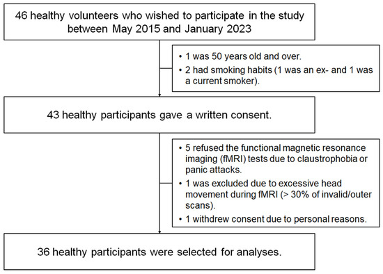 Forty-six healthy volunteers participated in the study between May 2015 and January 2023. Our selection criteria included individuals aged 20–50 years who had never smoked (see Methods and Participants). Candidates aged >50 years (n = 1) and current or former smokers (n = 2) were excluded. Furthermore, seven applicants were excluded owing to MRI refusal due to claustrophobia or panic attack (n = 5), excessive head movement during fMRI (>30% of invalid/outlier scans detected by Artefact Detection Tools (ART)) (n = 1), and the withdrawal of consent for personal reasons (n = 1). The remaining 36 participants (18 women and 18 men) were selected for further analysis (Figure 2, Table 1). Notably, all participants reported dyspnoea levels of 0 at rest on the modified Borg scale and scored 30 points on the revised Hasegawa dementia scale [24]. None of the participants showed abnormal pathological findings on anatomical T1- or T2-weighted MRI.